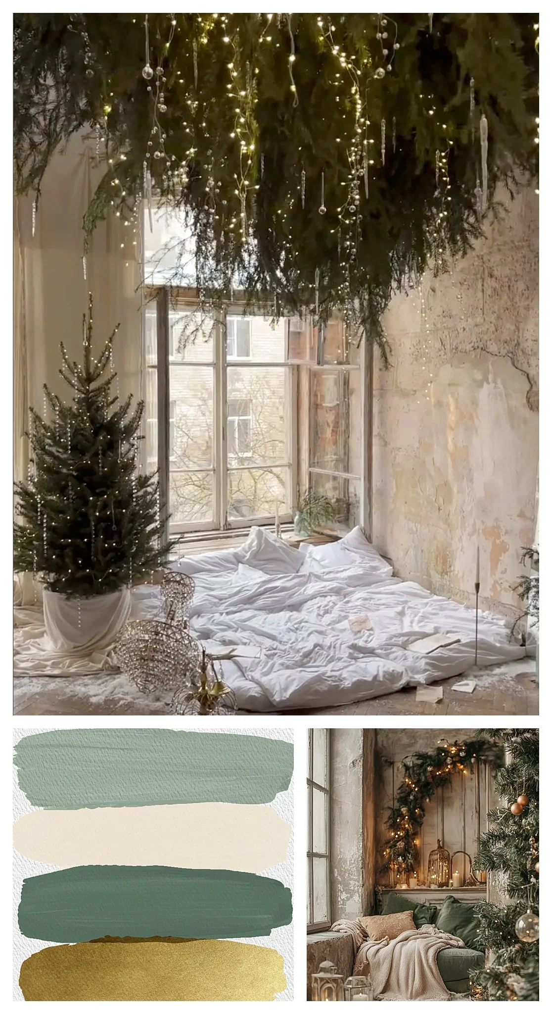 Capture the spirit of a cozy Christmas morning in our Evergreen dreams set. With its subtle textured walls, lush greenery, and warm golden details, this inviting space feels like a vintage holiday retreat. A natural wood-toned set styled with soft velvet curtains and seasonal greenery overhead makes it the perfect backdrop for snuggly, heartfelt family moments.